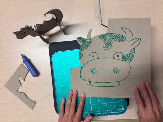 Voer je karton tegen de snijkop, geef een duwtje en de kartonsnijder hapt zich er met gemak doorheen. Zo maak je in een handomdraai hele bouwwerken, maar ook dieren of een auto